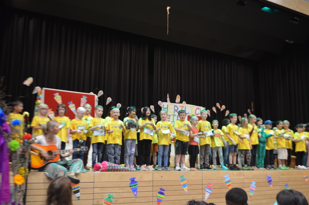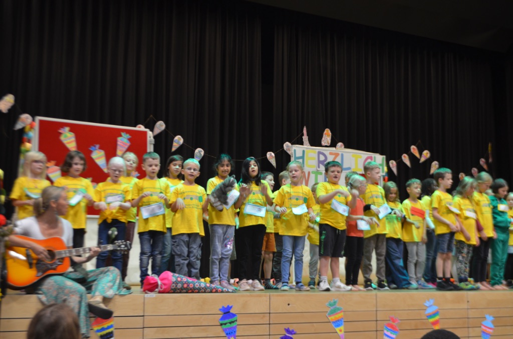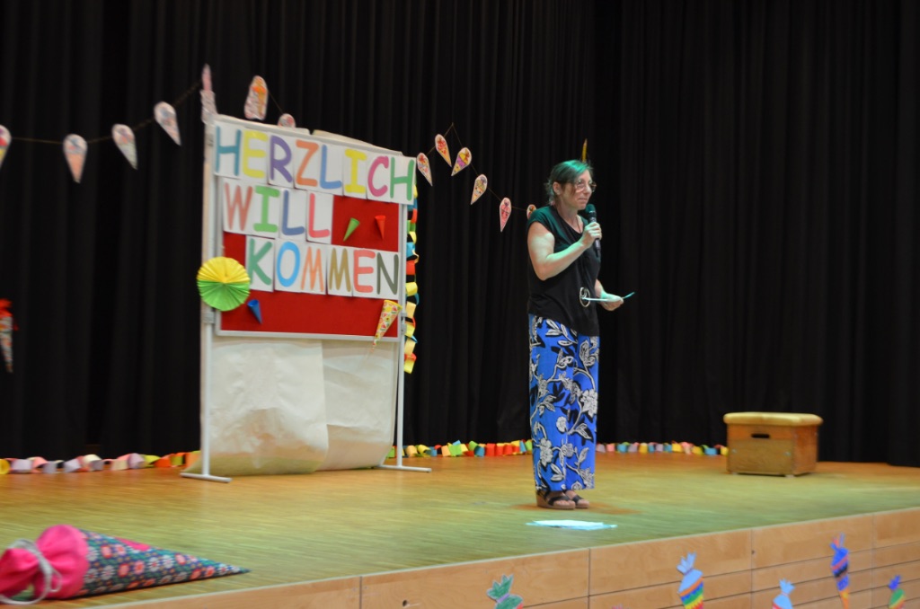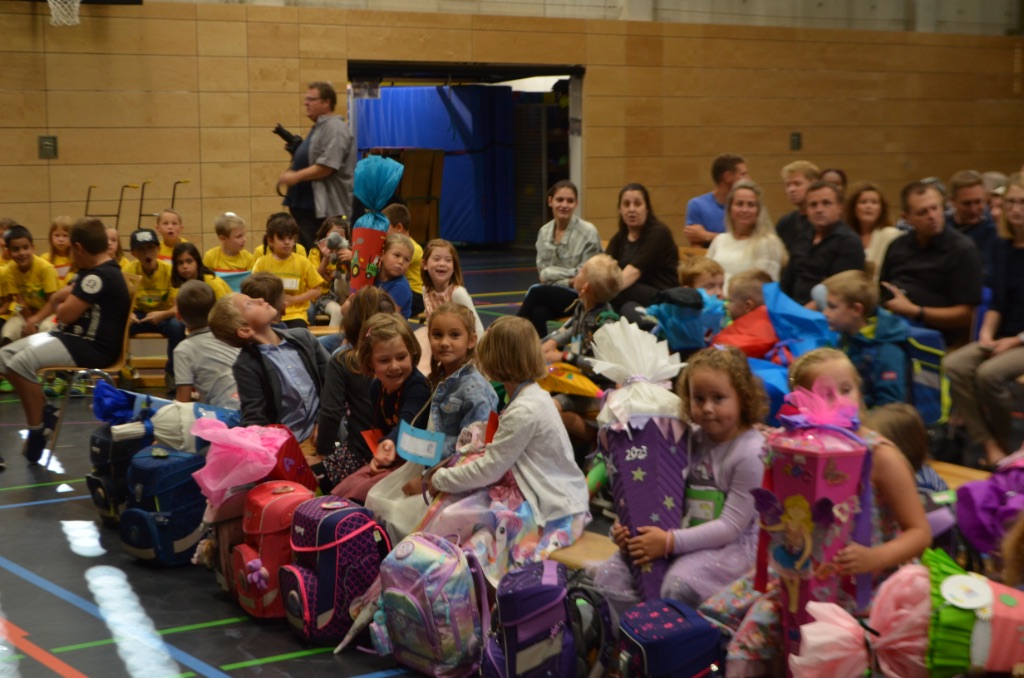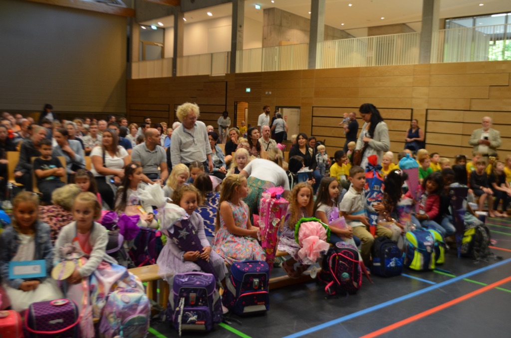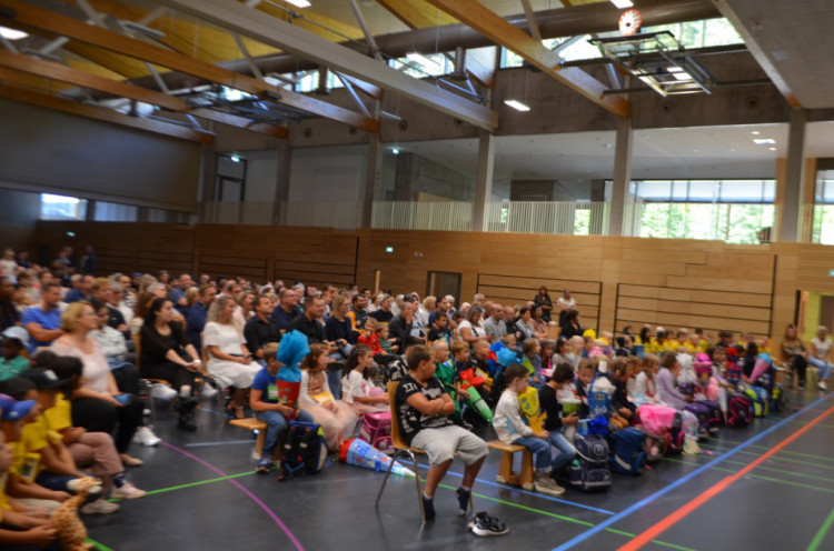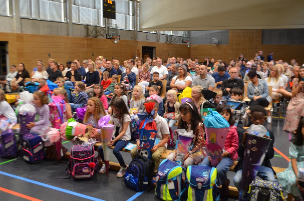 Am Freitag, den 15.9. fand die Einschulungsfeier der neuen Erstklässler:innen in der Mehrzweckhalle statt. 42 neue Schulkinder waren aufgeregt und gespannt auf ihren ersten Tag. Sie wurden mit dem Schullied „Viele kleine Leute“ von ihren Paten aus der zweiten Klassenstufe in der Buchenbrand-Grundschule begrüßt. Die Theaterprojektgruppe führte ein Stück „Das schönste auf der Welt“ auf, bevor auch Rektorin Andrea Krämer die neuen Schüler:innen herzlich begrüßte, ihnen aus ihrer eigenen Schultüte Dinge hervorzauberte, wie beispielsweise einen Ball, der für Bewegung in der Schule stehe. Bewegung war auch seit den Ferien in die Schulstruktur gekommen, denn erstmalig kamen die neuen Erstklässler:innen in jahrgangsgemischte Klassen aus erster und zweiter Klassenstufe. Ihre Paten aus Jahrgangsstufe 2 nahmen ihre neuen Mitschüler:innen auf der Bühne in den vier Lerngruppen in Empfang. JAlle freuen sich auf den gemeinsamen Weg und blicken positiv auf die Zukunft der Kinder.