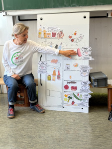 Die zweite Gruppe setzte sich intensiv mit saisonalem Gemüse und Obst auseinander. Die Kinder lernten, zu welcher Jahreszeit verschiedene Obst- und Gemüsesorten bei uns wachsen und warum man Auslandsimporte meiden sollte. Außerdem lernten die Kinder, wie ein Kühlschrank richtig eingeräumt wird, um Lebensmittel möglichst lange frisch zu halten und Abfall zu vermeiden. Spielerisch wurde vermittelt, welche Produkte wohin gehören und warum Ordnung im Kühlschrank wichtig ist.